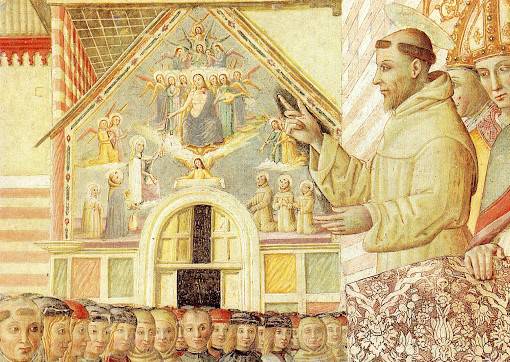Francesco sentiva anche una forte affinità con Maria, perché come lei aveva scelto di vivere nella povertà e nell’umiltà. Egli si sentiva figlio suo prediletto e le affidava la sua vita e quella dei suoi frati. Francesco amava particolarmente il luogo dove era stata costruita una chiesetta, la Porziuncola. Qui egli ebbe l’inizio della sua vocazione francescana e qui ricevette una grazia speciale da parte della Vergine: il sogno del perdono.