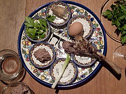 Beitzah – Un uovo bollito, a simboleggiare il korban chagigah (il sacrificio festivo) che veniva offerto al tempio di Gerusalemme, viene poi arrostito al forno e consumato come parte del pasto del Seder. Sebbene sia il sacrificio di Pesach che quello del chagigah fossero in origine di carne, oggi per il chagigah si utilizza un uovo, simbolo del lutto (le uova sono tradizionalmente la prima pietanza servita dopo un funerale ebraico), richiamando il sentimento di dolore per la distruzione del Tempio di Gerusalemme e la conseguente impossibilità di offrire proprio lì i sacrifici ordinati nei testi sacri in occasione della Pasqua. L’uso dell’uovo nel Seder di Pesach viene attestato per la prima volta in un commento del rabbino Moses Isserles riportato nel Shulchan Aruch, testo normativo ebraico del XVI secolo, ma il periodo preciso in cui iniziò tale usanza è sconosciuto.[3] L’uovo non viene comunque utilizzato durante la parte cerimoniale “ufficiale” del Seder. Alcuni ne mangiano uno sodo immerso in acqua salata o aceto come antipasto. L’uovo è anche il simbolo del cerchio della vita: nascita, riproduzione e morte.